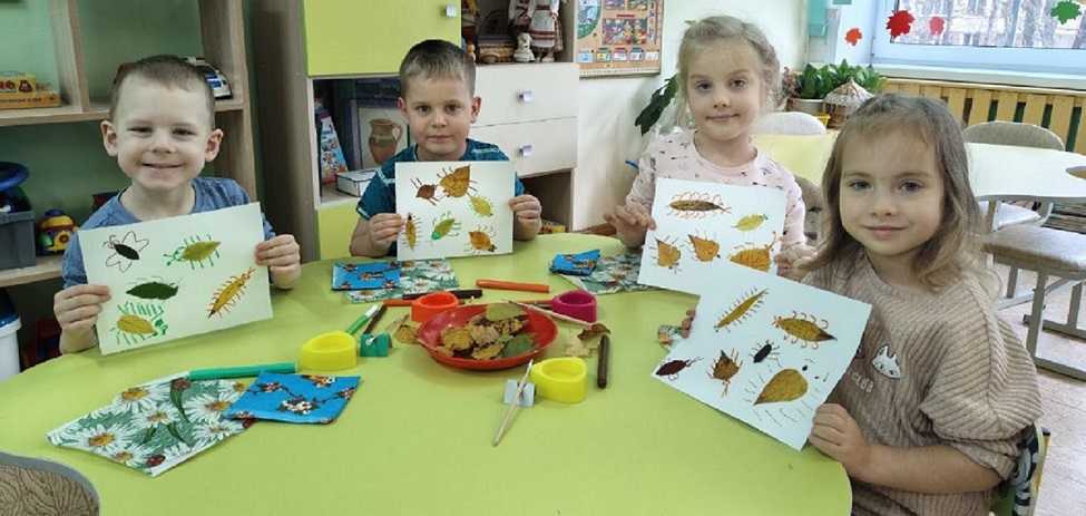 Аппликации из осенних листьев – это не только завораживающий процесс, но и интересный результат. Из осенних листьев ребята сделали жучков, которые отличались размером и формой, как и листья в природе. А какие дизайнерские фоторамки у нас получились! В аппликации «Осеннее дерево» ребята использовали березовую кору и засушенные листья. Удивительные стрекозы получились из семян клена.